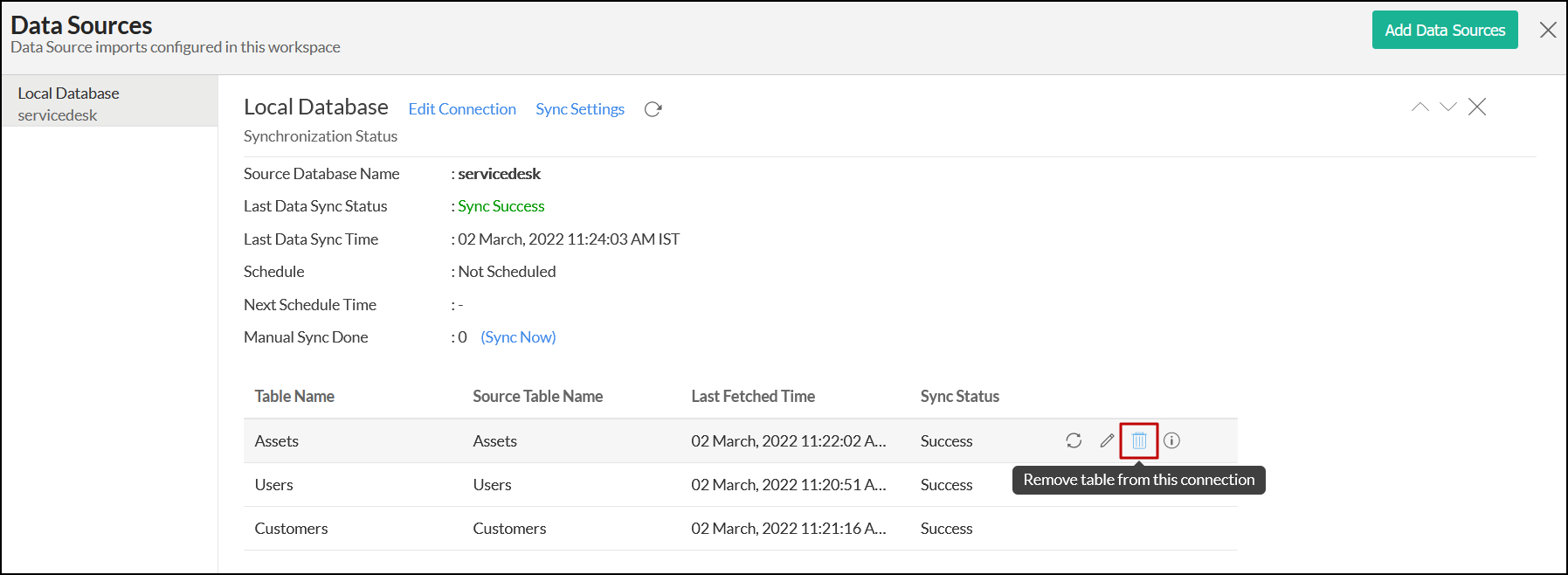 Analytics Plus allows you to remove the data source for an individual table, which ensures the table's data will not be synchronized with the configured data source. To do this, head to the Data Sources section from the side panel, and click the delete icon that appears on mouse over the required table name. This action breaks the connection between the table and the data source. The data residing in the table at the time of data source deletion will remain unchanged.