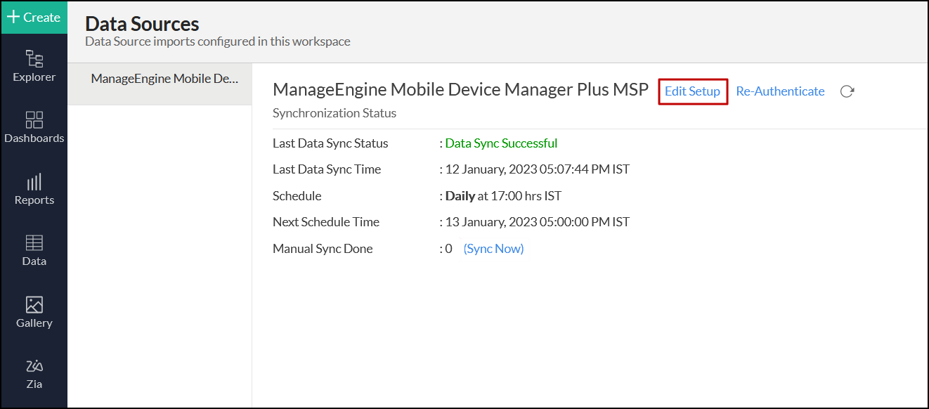 2. Navigate to the Mobile Device Manager Plus MSP data source, and click the Edit Setup link.