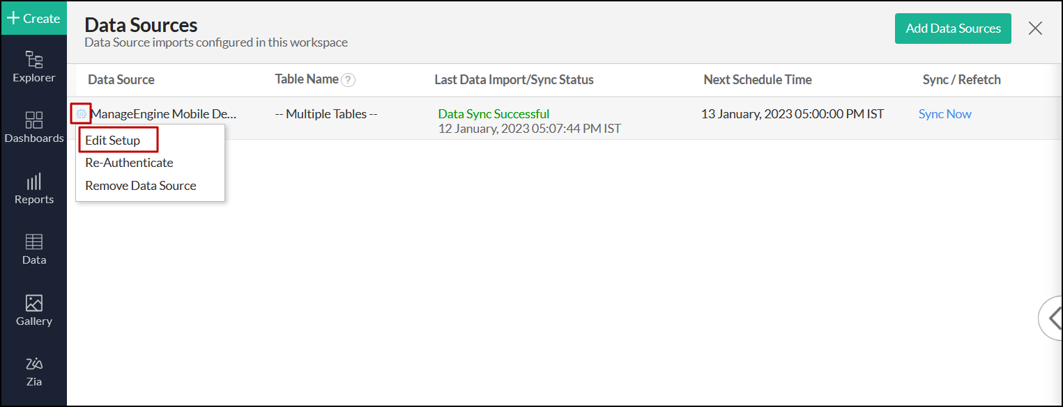 1. Click the Settings icon that appears on mouse over on the Mobile Device Manager Plus MSP data source and click the Edit Setup option.