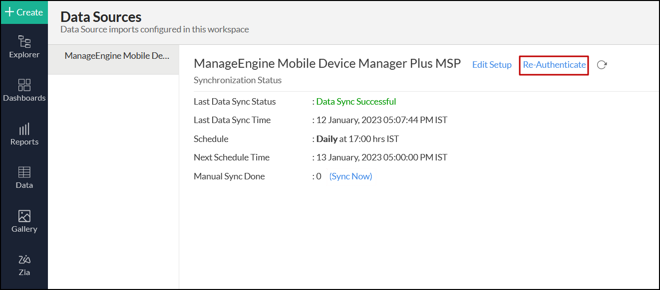 • Click the Data Sources option from the side panel and click the Re-Authenticate link.