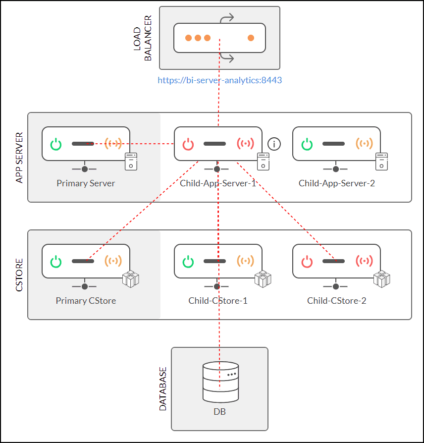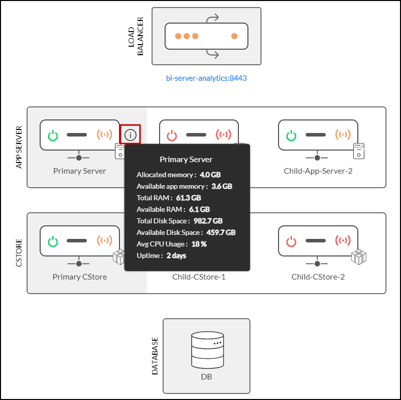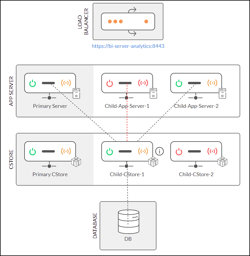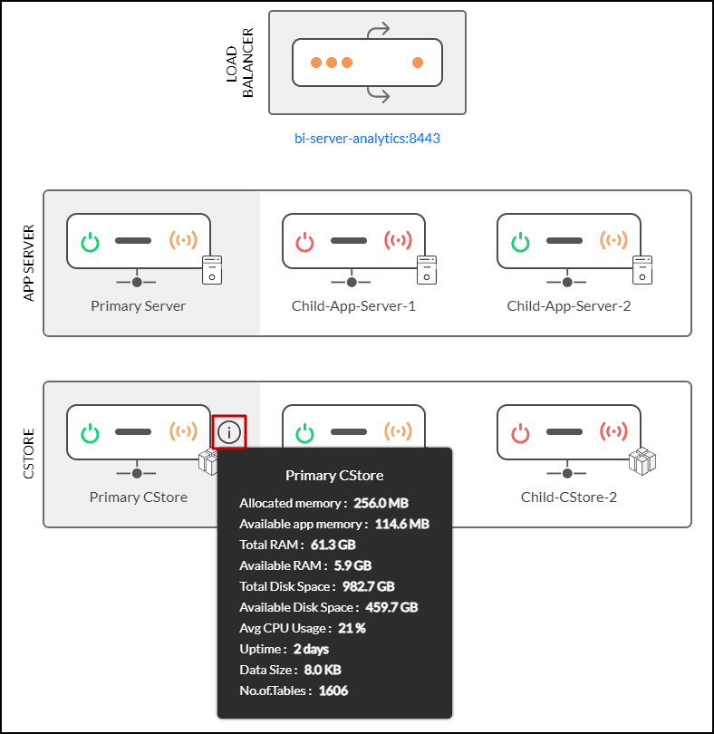 - Red: Indicates inactive connection between the App Server and CStore nodes as the App Server/CStore node is inactive.