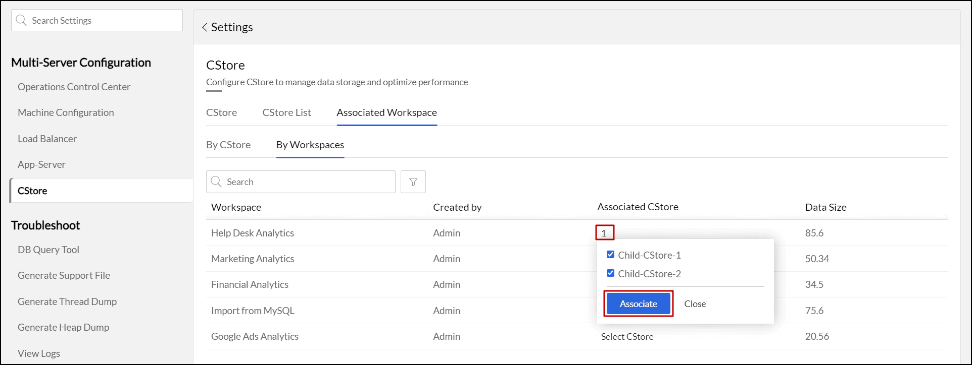 - The Associate Workspace tab will appear only if you have at least one child CStore configured in Analytics Plus.