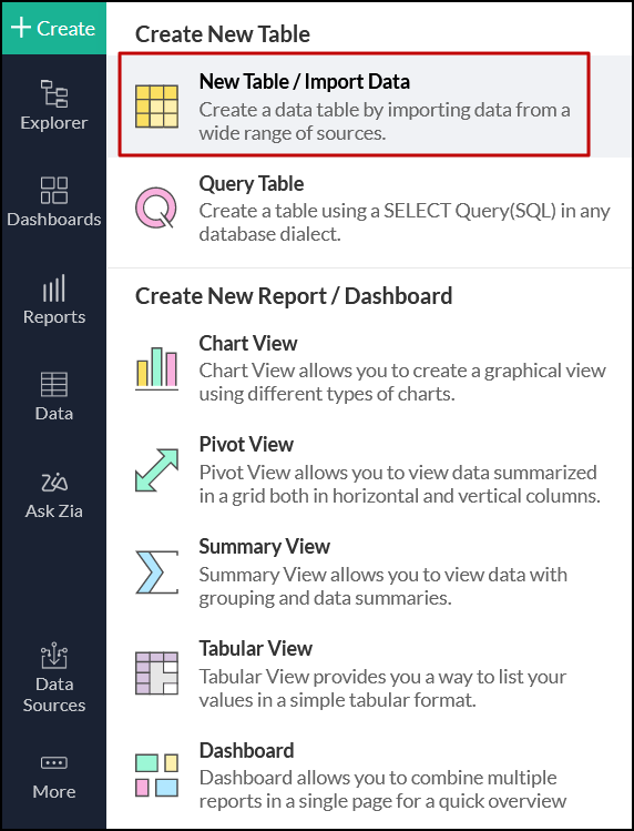 Open the required workspace, click the Create button from the side panel, and select the New Table / Import Data option.