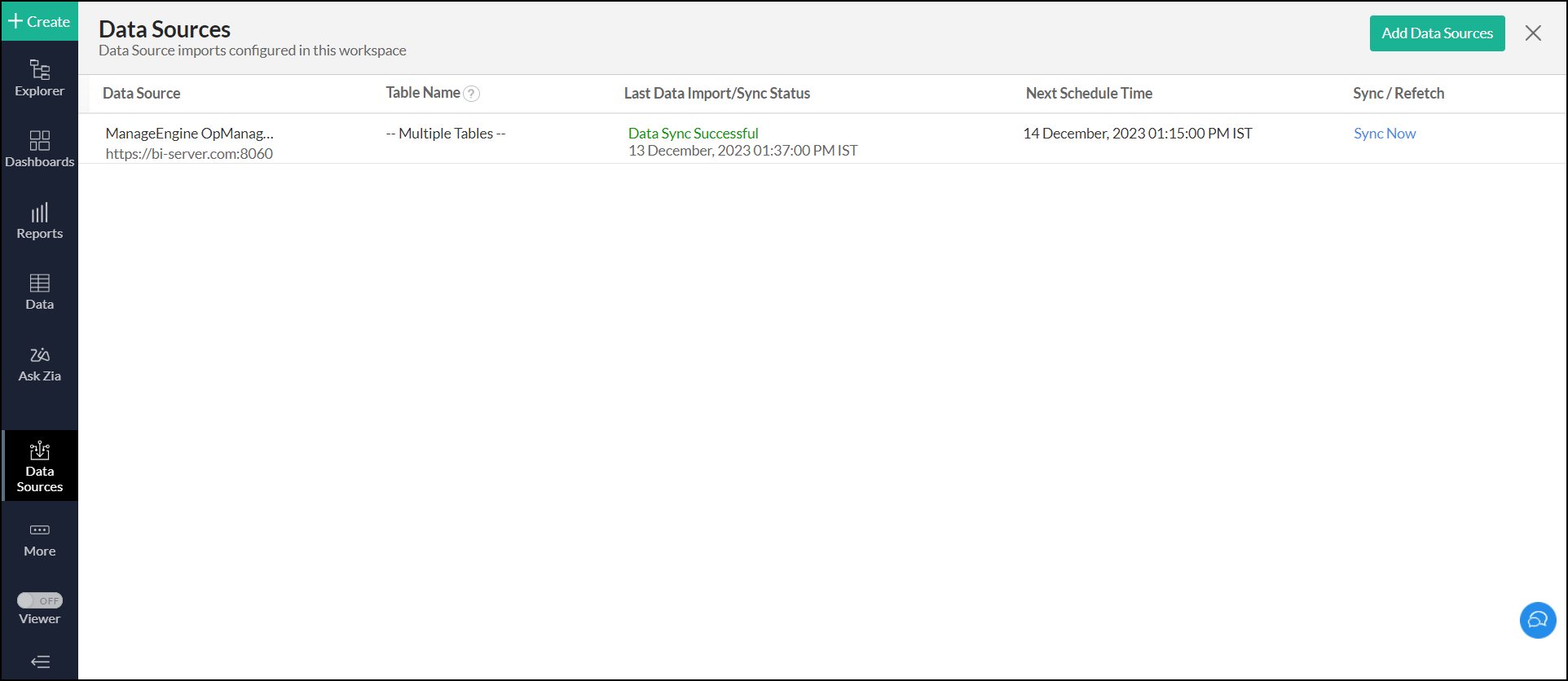 Click the Data Sources button from the side panel. This opens the Data Sources summary page which lists all the configured data sources in the workspace.