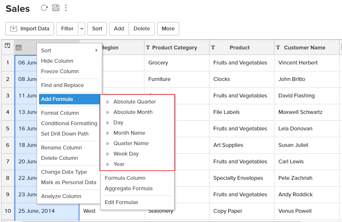• Select Add > Formula Column option from the toolbar or select a column in the table and choose Formula Column from the right click pop-up menu.
