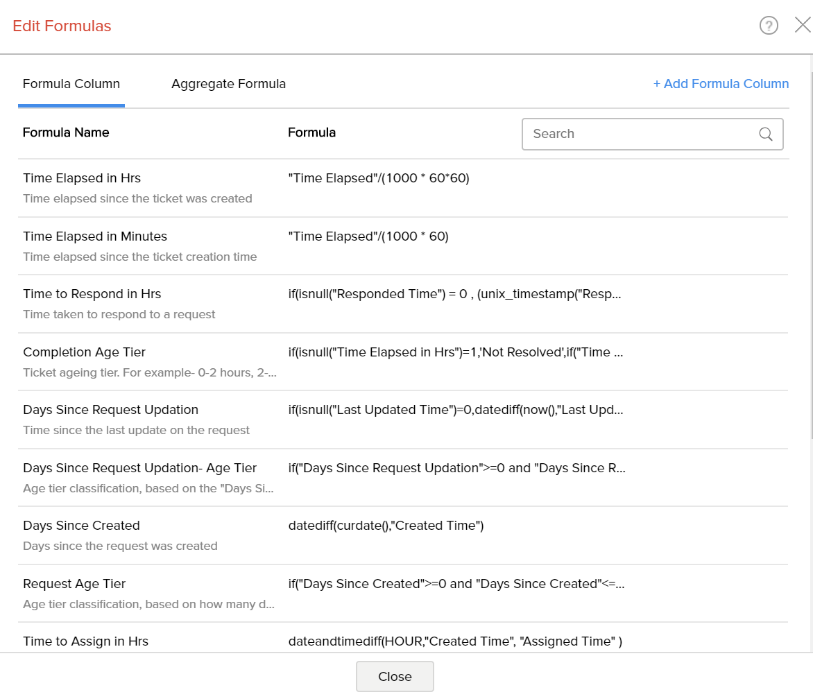 ManageEngine Analytics Plus allows you to view, edit, format and delete all the formulas defined for a table through the Edit Formula option. You can view & edit both Custom Formulas and Aggregate Formulas using this option. To view/edit existing custom or aggregate formulas: