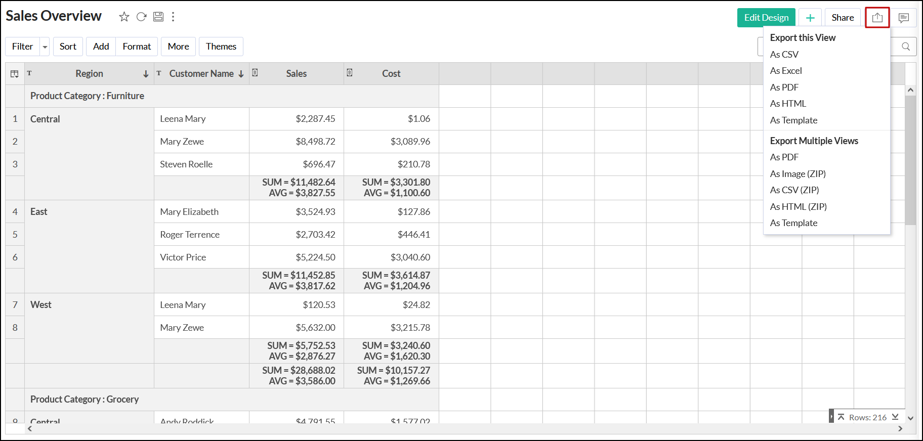 Analytics Plus allows you to export the tabular view into various file formats like CSV, PDF, XLS, and HTML. Follow the steps below to do this: