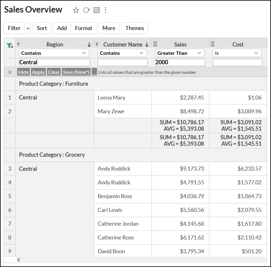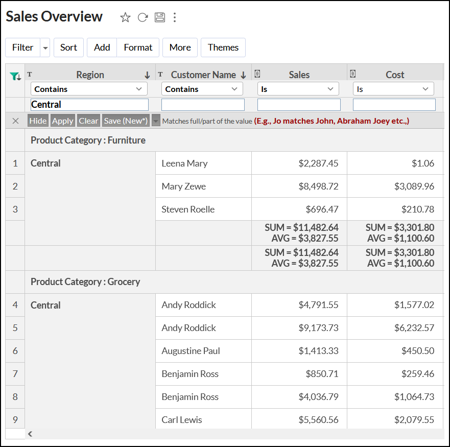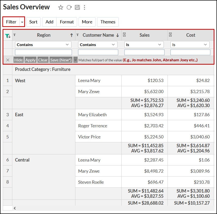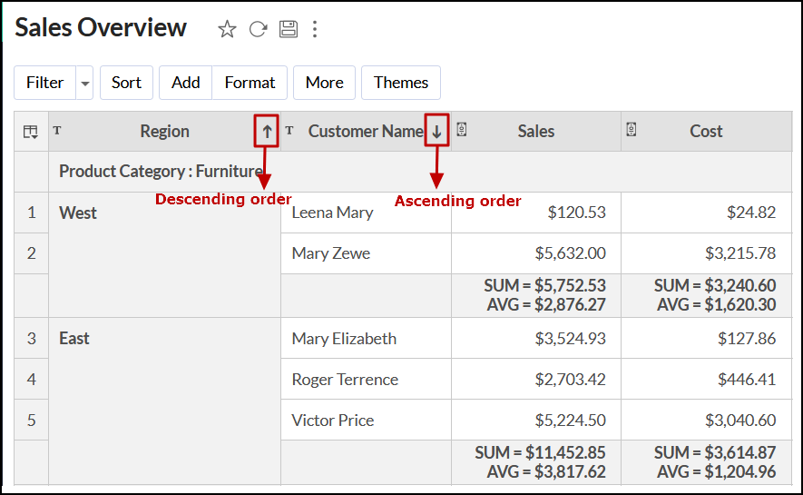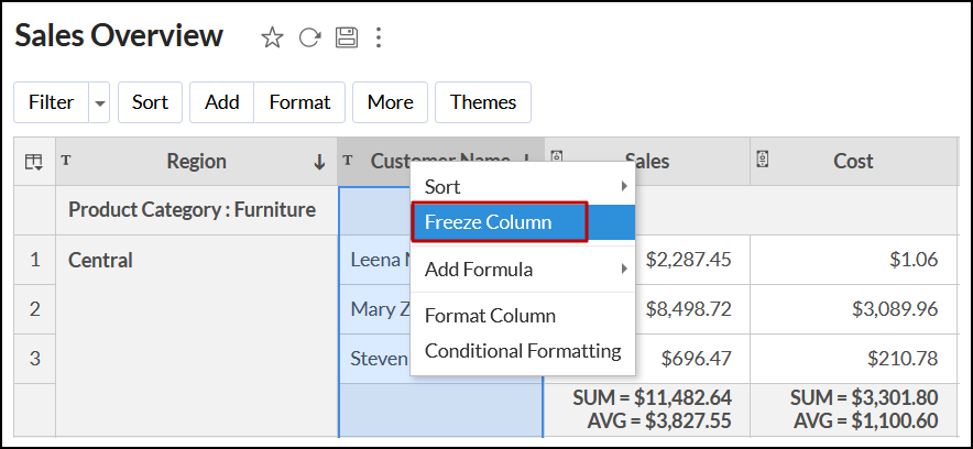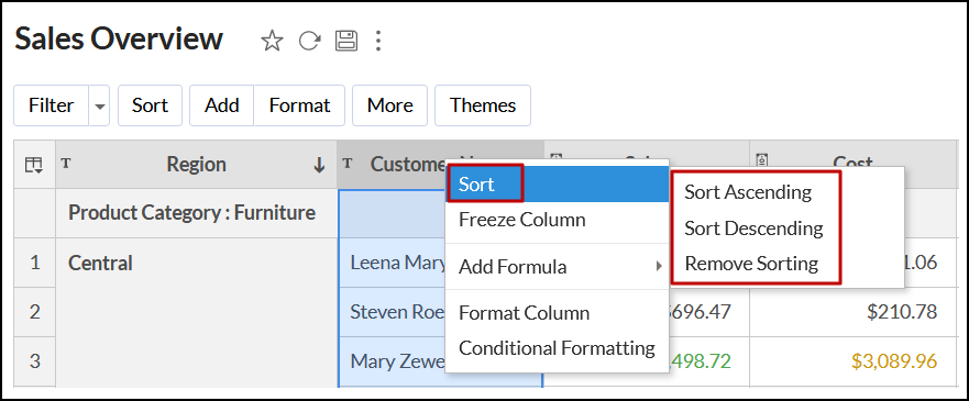 Analytics Plus provides various options to sort, filter, format, and freeze the columns in a tabular view. In this document, we will discuss these options in detail.