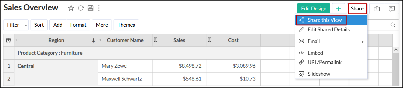 1. Open the required tabular view and click Share > Share this View in the toolbar.