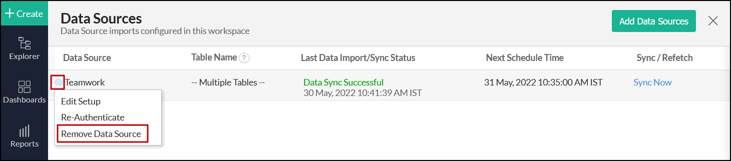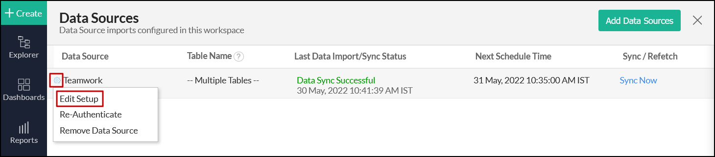 1. Click the Settings icon that appears on mouse over on the Teamwork data source and click the Edit Setup option.