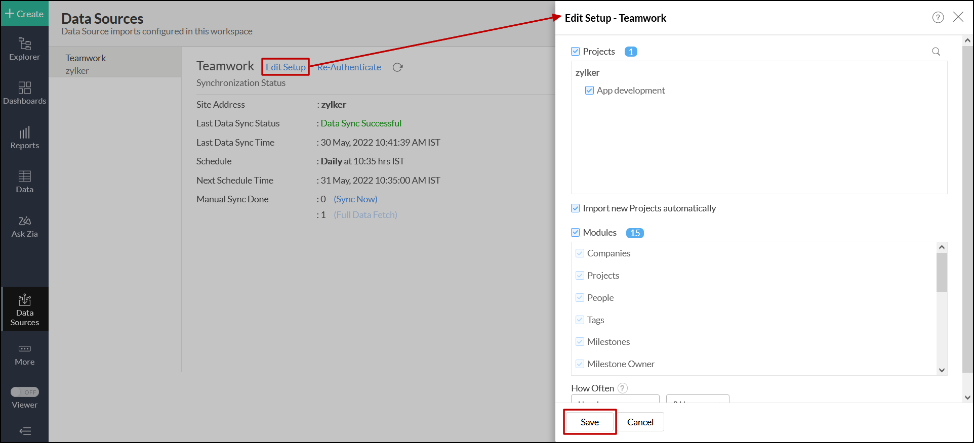 2. Navigate to the Teamwork data source, and click the Edit Setup link.