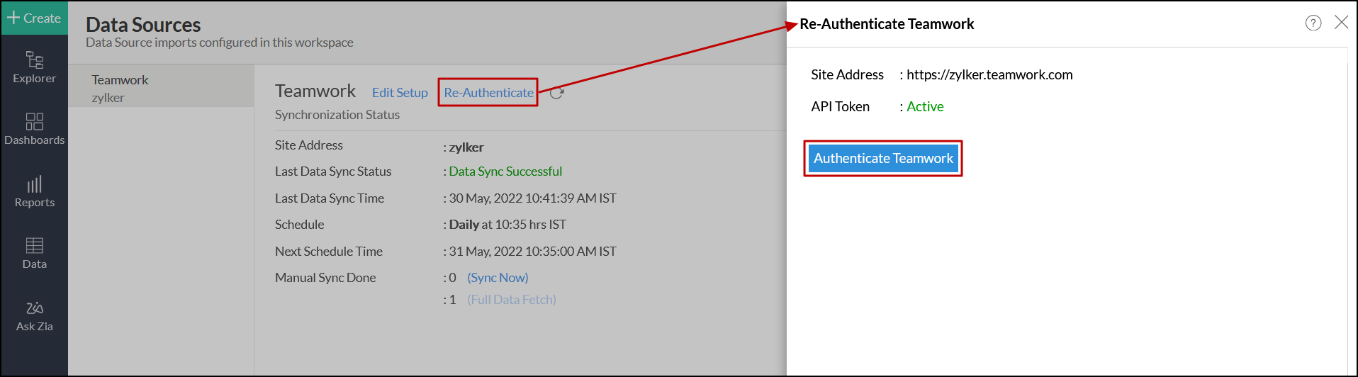 2. Navigate to the Teamwork data source, and click the Re-Authenticate link.
