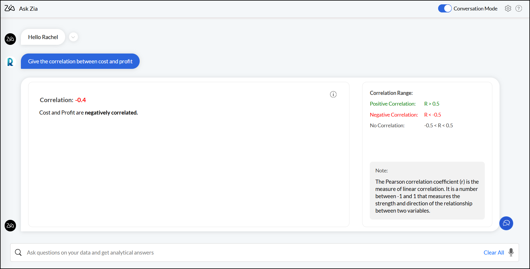 Ask Zia allows you to determine the correlation, a statistical measure that helps to identify how changes in one variable relate to changes in one or more variables. For example, in help desk metrics, how different factors like response time and resolution time affect customer satisfaction scores.
