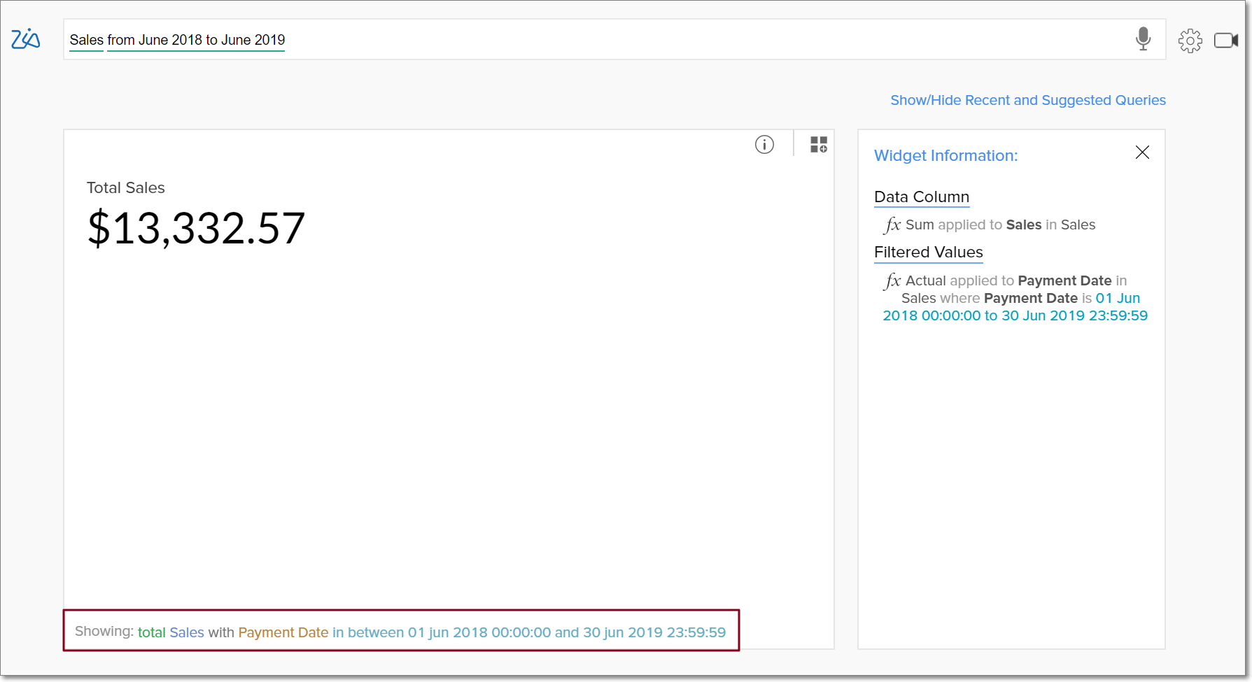 Ask Zia allows you to filter date ranges, exact dates, and relative dates like 'This month', 'Last quarter', etc. For example, 'Sales from June 2018 to June 2019' displays a widget of the total sales in that date range, while 'Sales this year' displays the total sales in the current year.