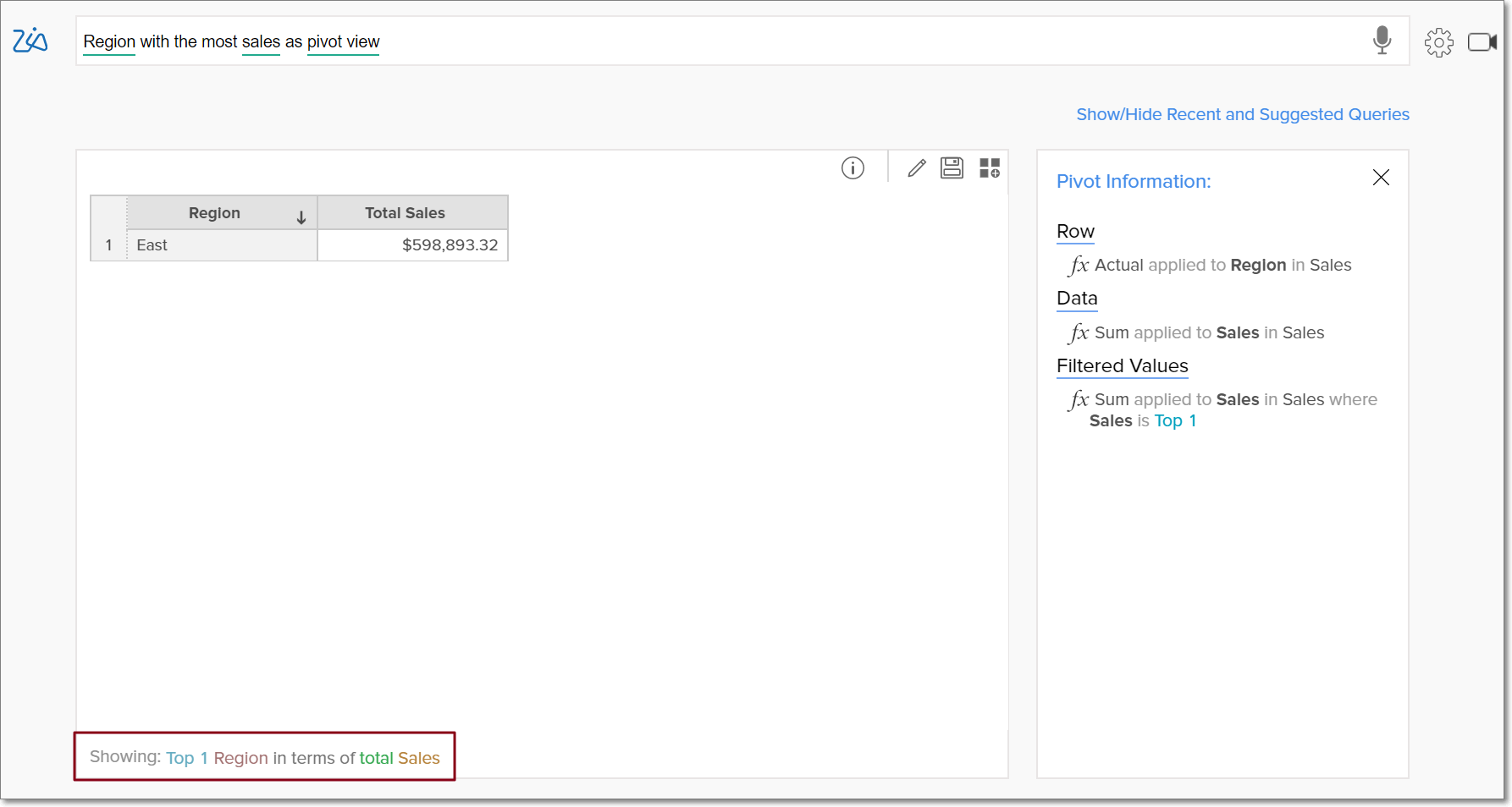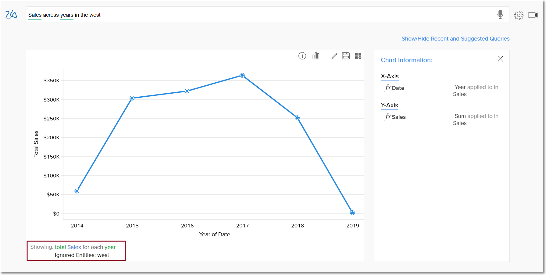 • Grouping a single metric by single or multiple columns: For example, 'What is my sales across regions' groups the Sales data by Regions. This can also be extended as 'What is my sales across regions every year' to group Sales data by Region and Date.