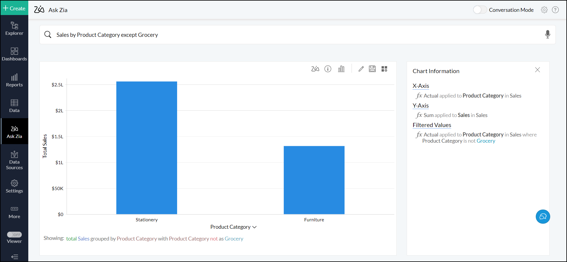 Ask Zia enables you to exclude a set of data from the report using the following filter negations: exclude, except, ignore, without, etc. For example, 'Sales based on Product Category except Grocery' displays the sales chart excluding the sales of Grocery(product category).