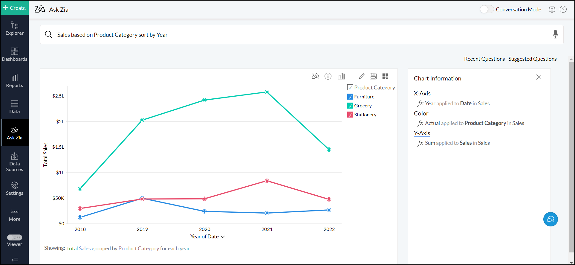 Ask Zia allows you to sort the reports in ascending or descending order or based on any column values. For example, 'Sales based on Product Category sort by Year' displays a chart with total sales grouped based on product category and sorted based on the year.