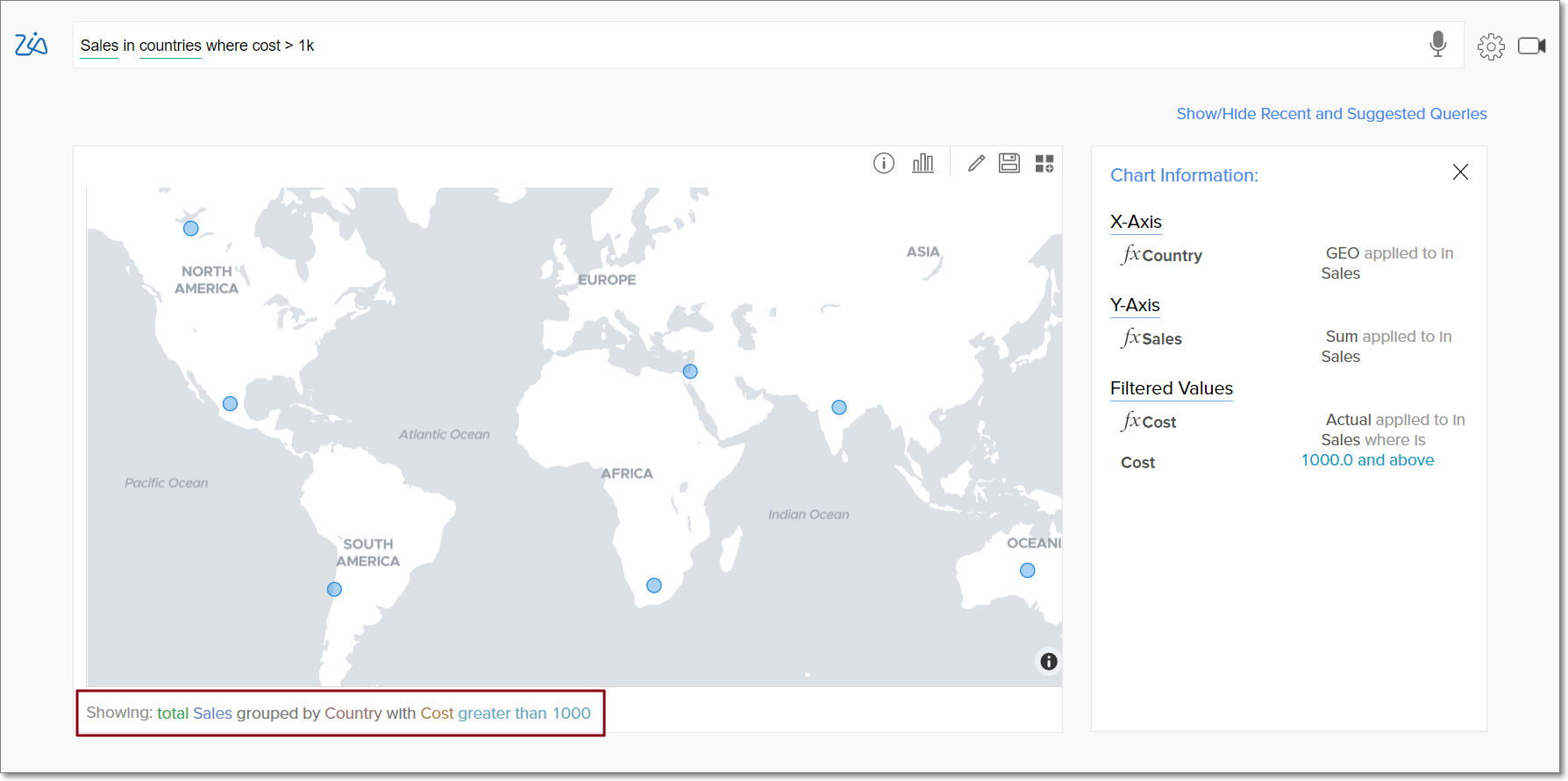 You can filter numeric columns either by a range or by using phrases like 'greater than', 'highest', etc. For example, 'Sales in countries where cost > 1k' generates a map chart without the cost values lesser than 1k.