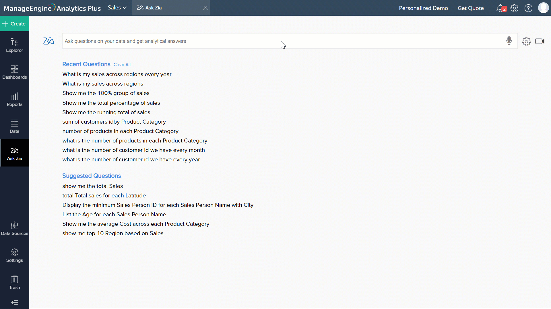 Questions that contain explicit information (i.e. names of columns present your tables) can be used in Ask Zia. For example, 'Give me the sales across regions', provides a chart of region wise sales, where Sales and Region are two columns from the Sales table.