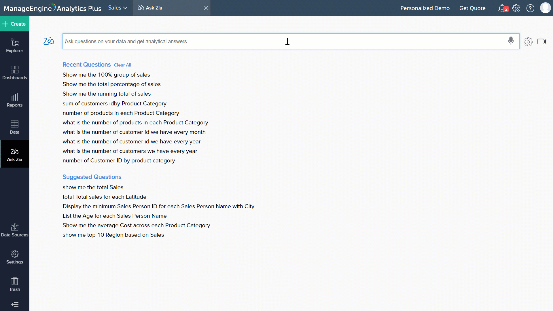 Analytics Plus provides a wide range of summary functions, such as sum and standard deviation, and advanced summarizing options like % of Previous value and Running total. (Refer the Summary functions and Advanced Summarizing functions sections to know more about the summary functions present in Analytics Plus.) Relevant summarizing functions will be used by Ask Zia while generating reports. These summary functions will also be listed as auto suggestions when framing your questions.
