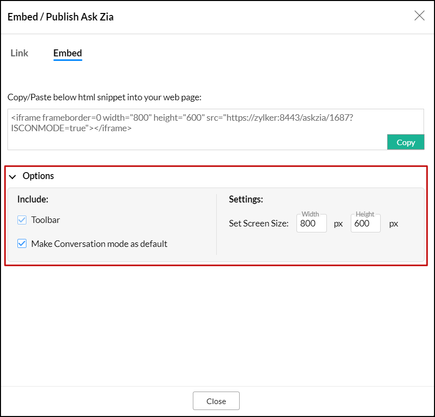 - Set Screen Size: This options lets you set the required screen size to embed the Ask Zia in your environment.