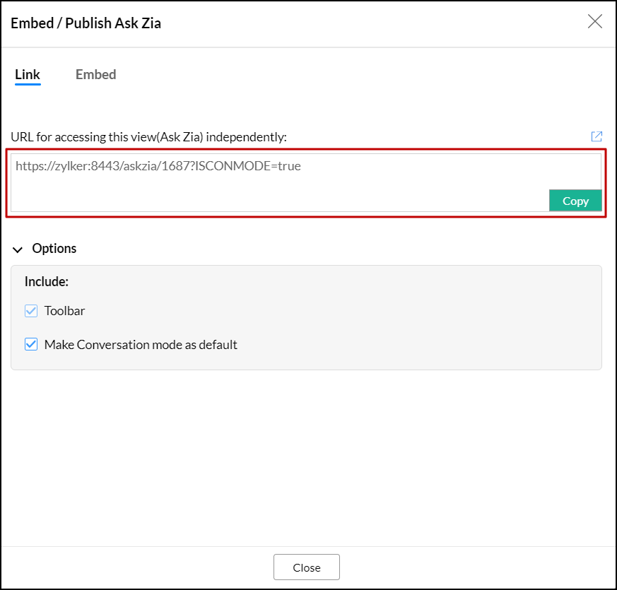 Analytics Plus paves a way to let your users securely access Ask Zia. You can either create a permalink or generate an embedded link and share it with the users to access Ask Zia and generate their own reports.