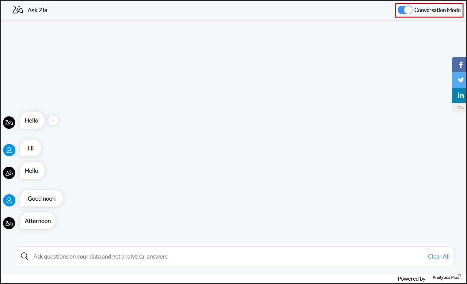 - Make Conversation mode as default: This option allows you to set the conservation mode as the default page for users. However, users can change it to normal mode by disabling the Conversation Mode toggle button. Click here to learn more about conversation mode in Ask Zia.