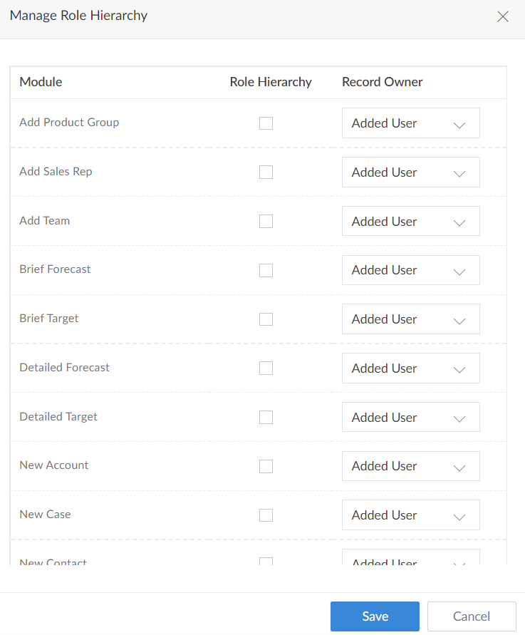 - The Role hierarchy tab will appear. In this tab, configure role hierarchy by choosing the owner of the respective record in each form. Then click Save.