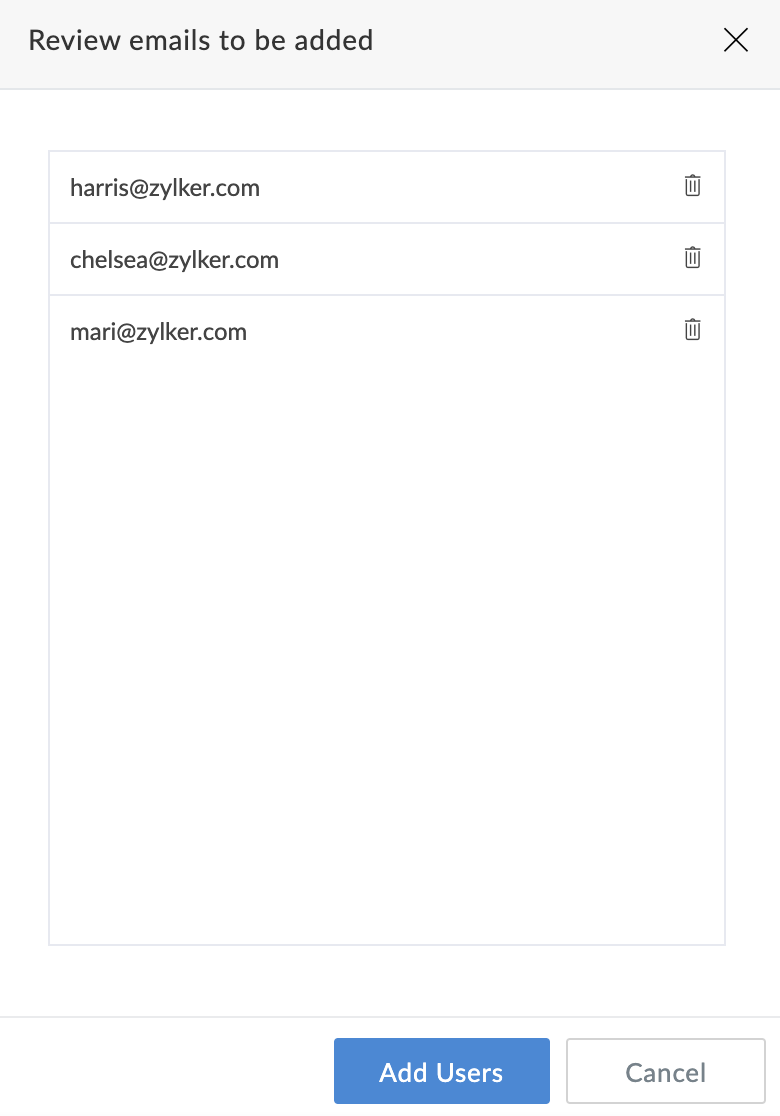 - The details of the users imported from the file will be displayed in the next tab. Now click Add Users.