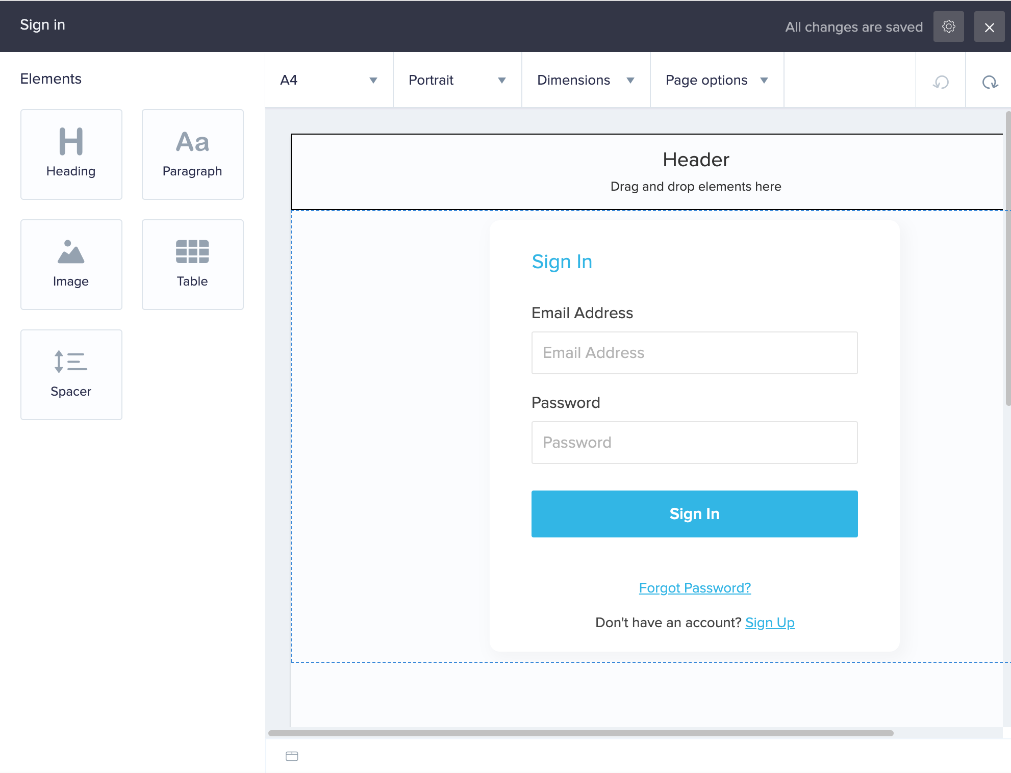 2. Drag and drop the required element onto the page. Alternatively, you can also double-click the required element. Its toolbar will appear at the top of the designer.