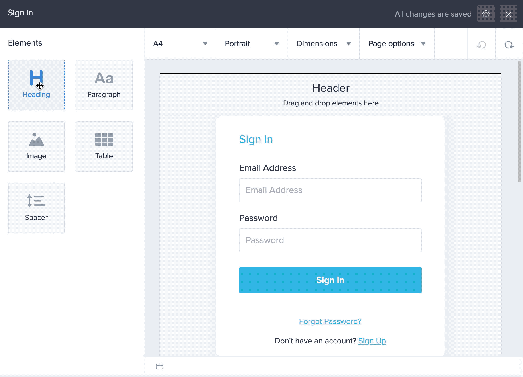 - Add elements: The elements tab on the left features the following predesigned elements that you can add to your Login page: Heading, Paragraph, Image, Table, and Spacer. The builder offers element-specific toolbars that allow you to customize their display value and appearance.