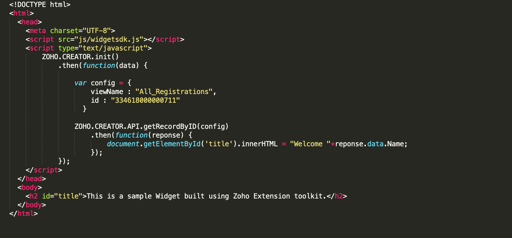 - Enter your code in the Widget.html file. The widget.html file contains the structure, design and components of the Widget. To use the ManageEngine AppCreator APIs in the widget, you can use the API helpers provided in the JS SDK Library.