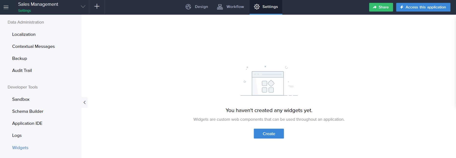 Note:The widgets should be hosted externally and linked up with AppCreator using the URL. - Navigate to the Settings page of the app in which you need to embed your widget. Select Widgets.