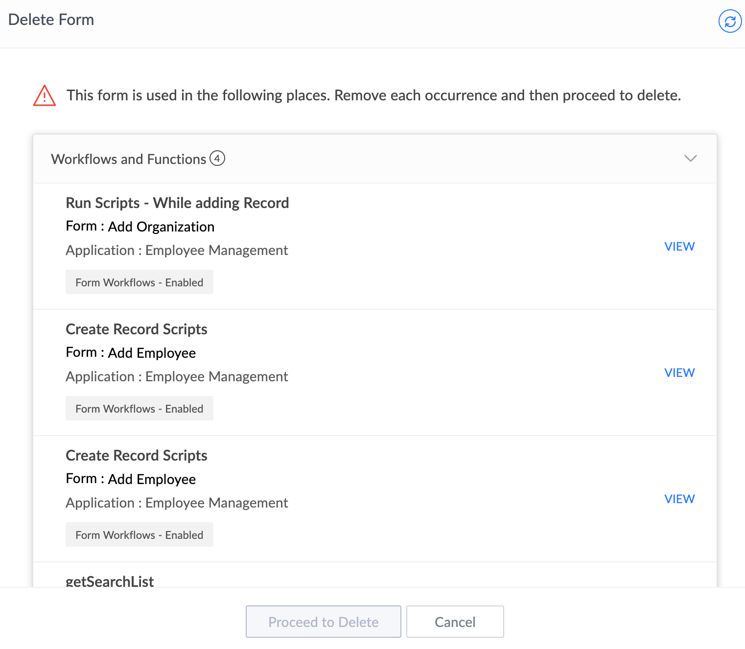 5. If the form you delete has been referred to in any other form, either as a subform or through a lookup field or in workflows, ManageEngine AppCreator will display the following prompt. You can click View and make the required changes.