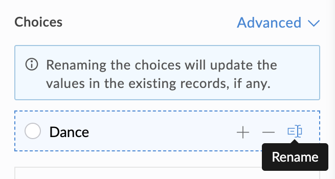 - On renaming the choices, the records with the existing values will be updated with the new choice values, wherever applicable. For instance, you have records with choice values as 'a', 'b', and 'c'. You rename 'a' to 'x'. Once this change is saved, wherever the value 'a' is found in the existing records, it will be replaced with the new value 'x'. But, the values 'b' and 'c' will remain unchanged.