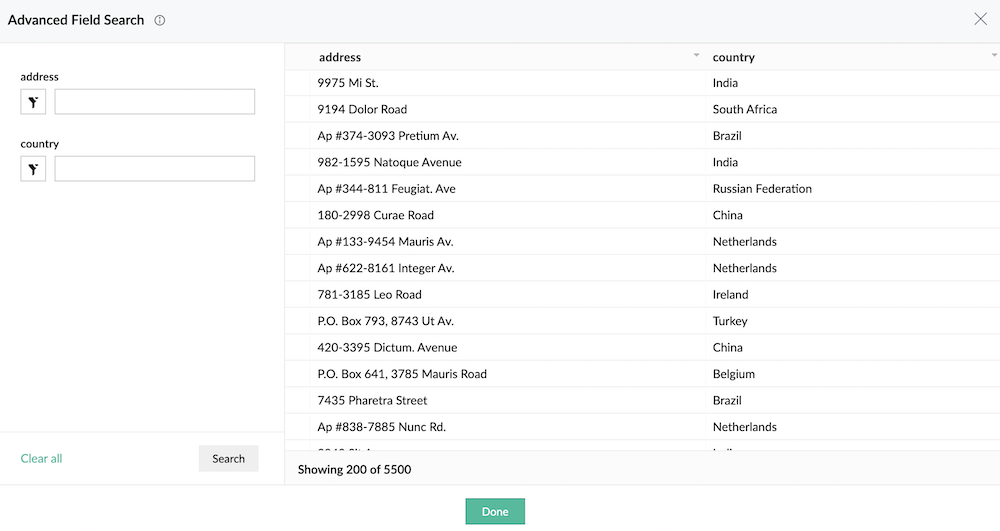 When the Lookup field has large number of records then finding a particular record becomes cumbersome. Moreover, the basic search will display only 5000 results and manually scrolling down through these results to find the required record is tedious. The Advanced search option will enable you use the advanced search mechanism and zero down on the required records or field values in the lookup fields.