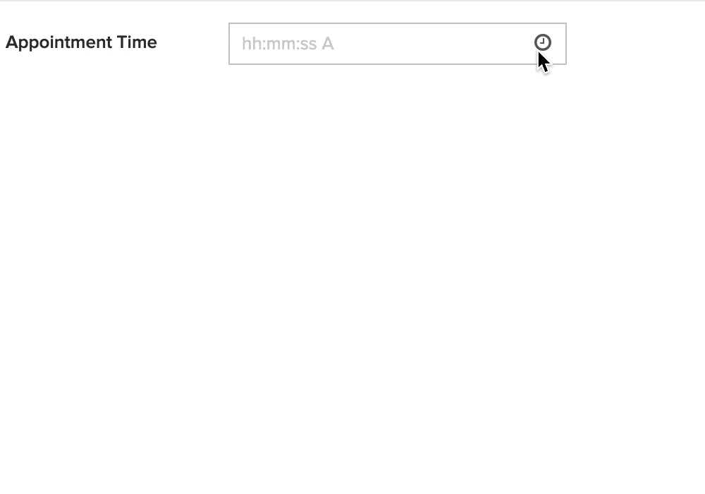 The time field enables your users to enter a valid time. They can either use a time picker or type the required time value. The time field displays time as per the time format and time zone set in your app's settings. Below is how a time field looks on a form:
