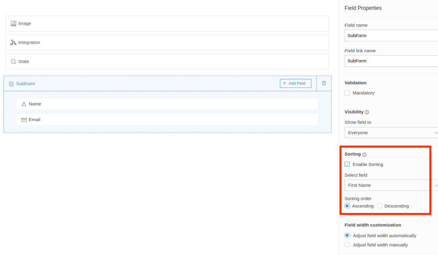 The subform field comes with the ability to sort the fields listed within the subform. It is available in the field properties of the subform. Sorting is aimed at requirements that need the fields in the subform to be sorted in a specific order.