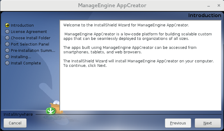 - Update the installation file's permission using the following command:chmod a+x ManageEngine_AppCreator.bin