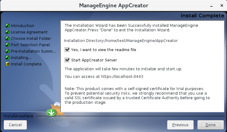- Upon successful installation, you'll see the host where you can access ManageEngine AppCreator. Also, you'll see prompts to start the server and to view the readme file after the installation is completed.