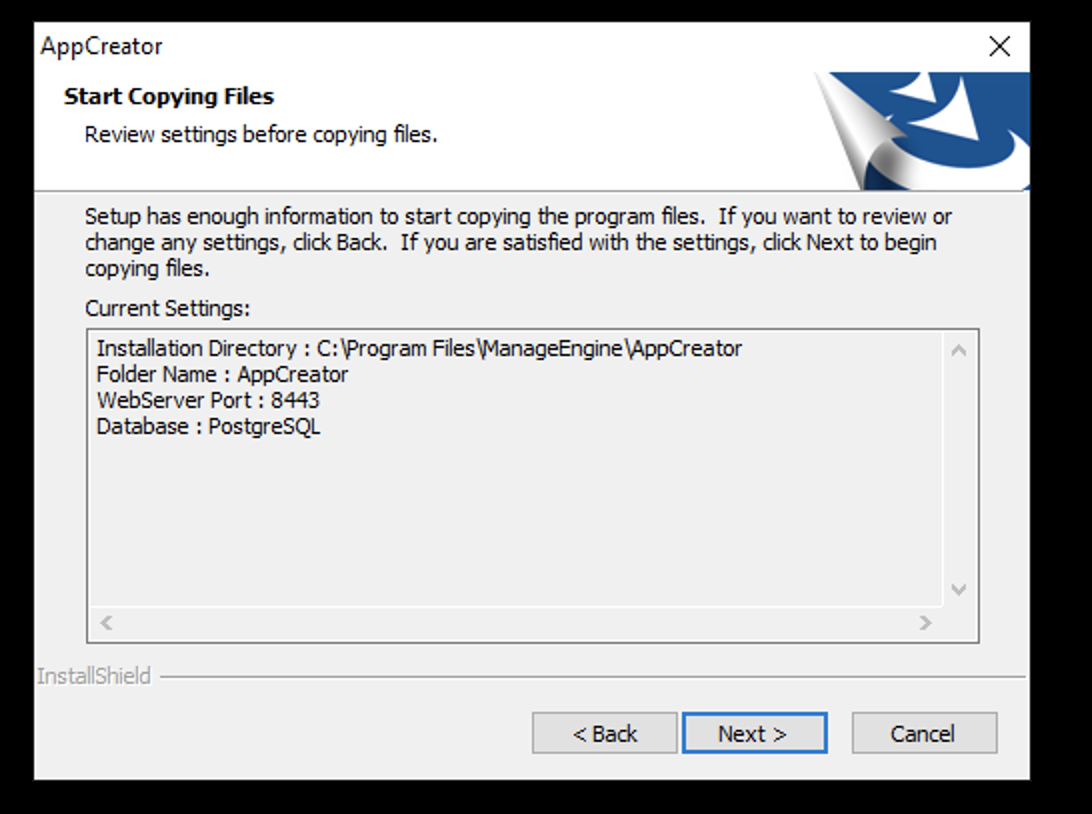 - Click Next in the InstallShield Wizard for ManageEngine AppCreator.