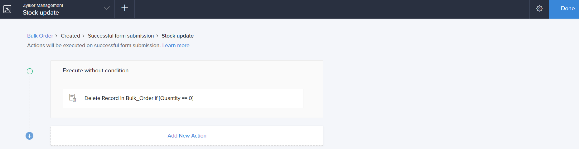 - ManageEngine AppCreator executes the action whenever there is an activity on the form. You can run the action for selected records by setting the criteria. Refer to the Set criteria page to learn more about setting criteria in a workflow.