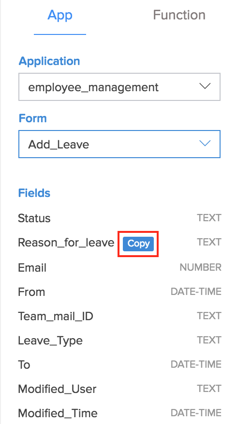 • Click the Refer Fields link in the top-right corner of the screen. The App tab will appear with the field deluge names for the fields in the form. The field deluge names across all the forms in your applications can be directly referred from this section instead of navigating to the respective field properties in the form builder.