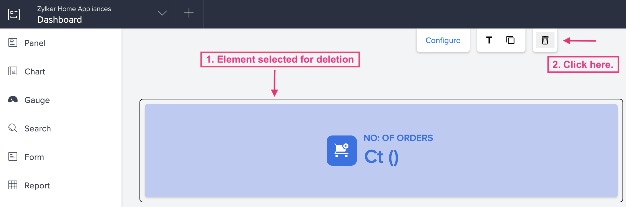 An element within a page can be removed or deleted at any time while building the page or while editing an existing page. All saved configurations for that particular element will also be removed. This delete action cannot be undone, except by recreating the deleted page element from scratch. The following are the steps to delete an element in your page: