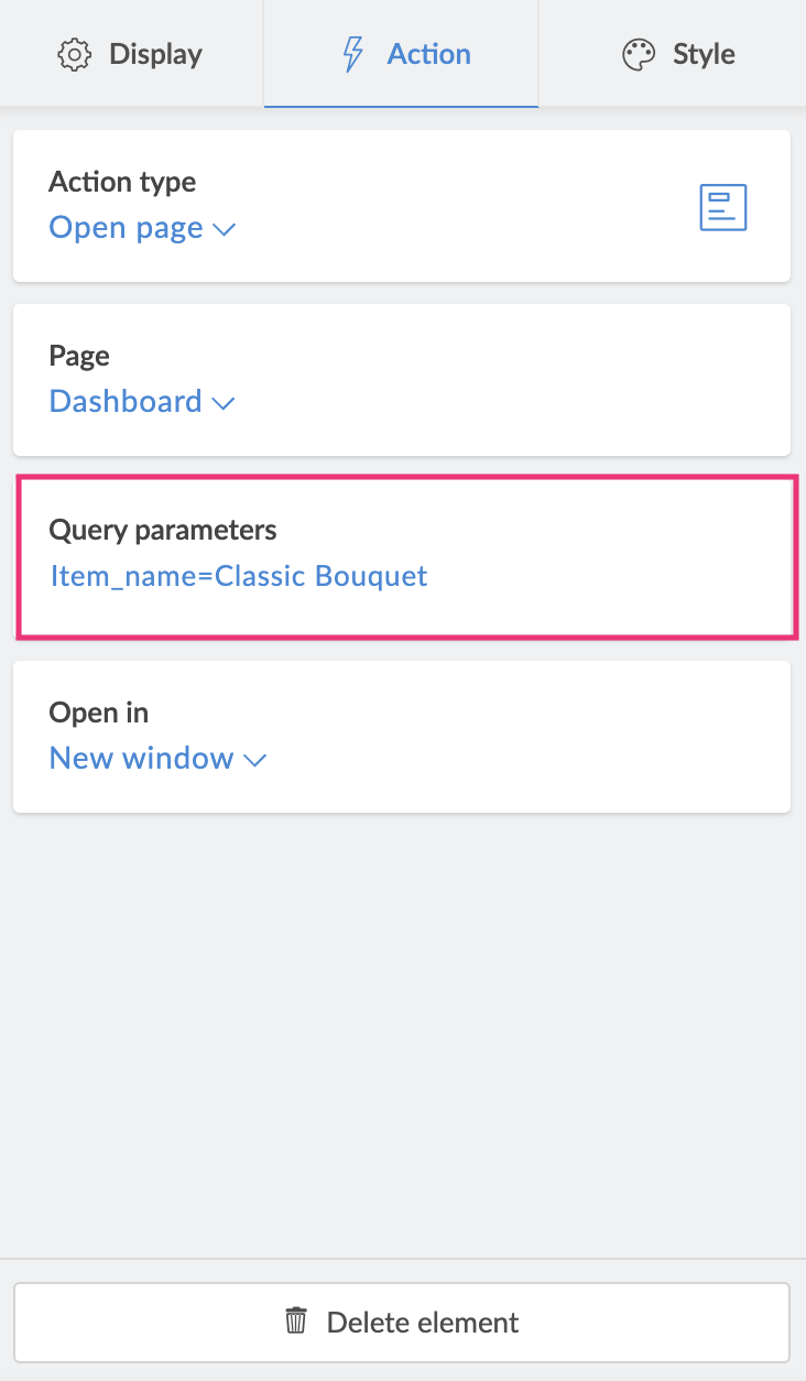 Adding a query parameter to an Open page action, provide values for parameters(associated page parameter) in the page to be opened.