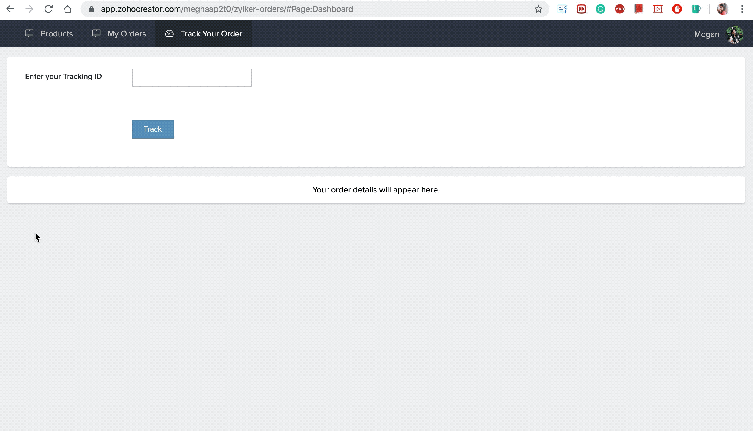 • An embedded stateless form containing a single line field named Enter your tracking ID in which users enter their tracking IDs. Upon form submission, it'll load the same page but with the page parameter (tracking_id) appended to the page URL in the format :