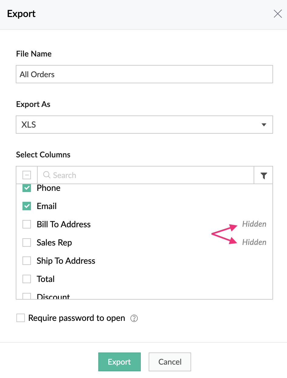 Hiding a column prevents the viewer from being able to view certain columns that you deem unnecessary. When you have hidden columns in your report, they will be displayed with a hidden tag in the columns listed in the Export popup.