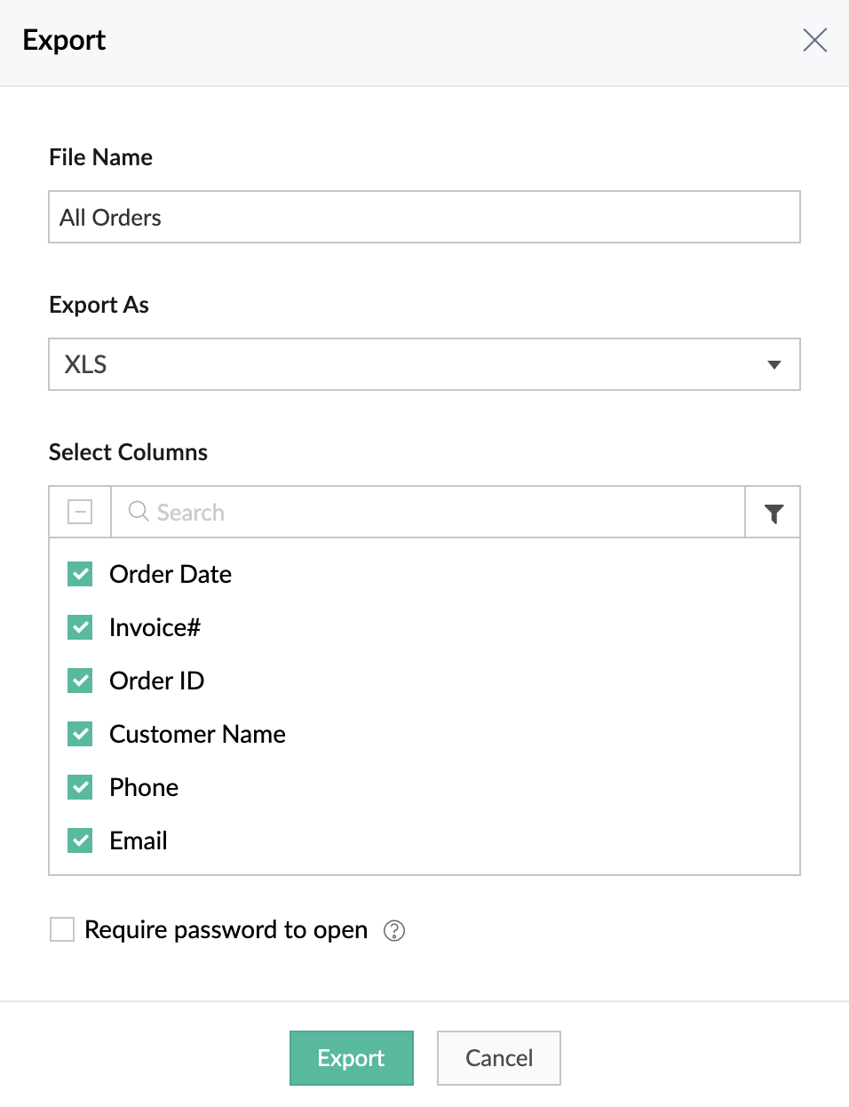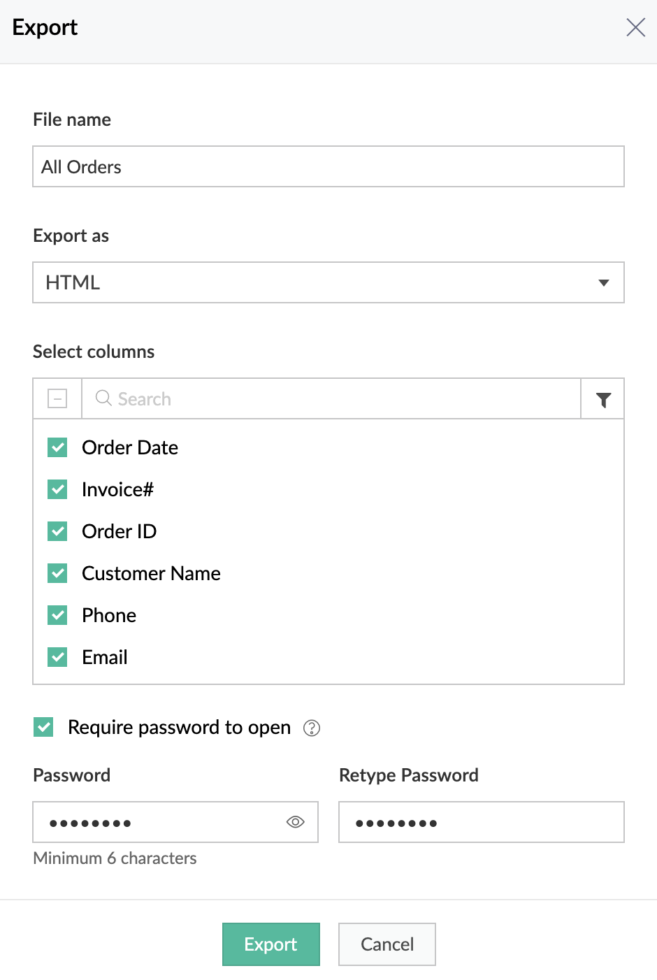 Exporting records help you obtain or download the records in your report into a specific format for a purpose outside of the ManagaEngine AppCreator environment. AppCreator enables you to export your reports in a few simple steps so that you can access them offline and email them to your colleagues who are non-ManageEngine users. You can perform export operations across all the three platforms supported by AppCreator — web, mobile and tablet. AppCreator also enables you to secure the exported file with a password. As a precautionary measure to safeguard yourself from unknown security threats, it is recommended that you protect your exported files with a strong password.