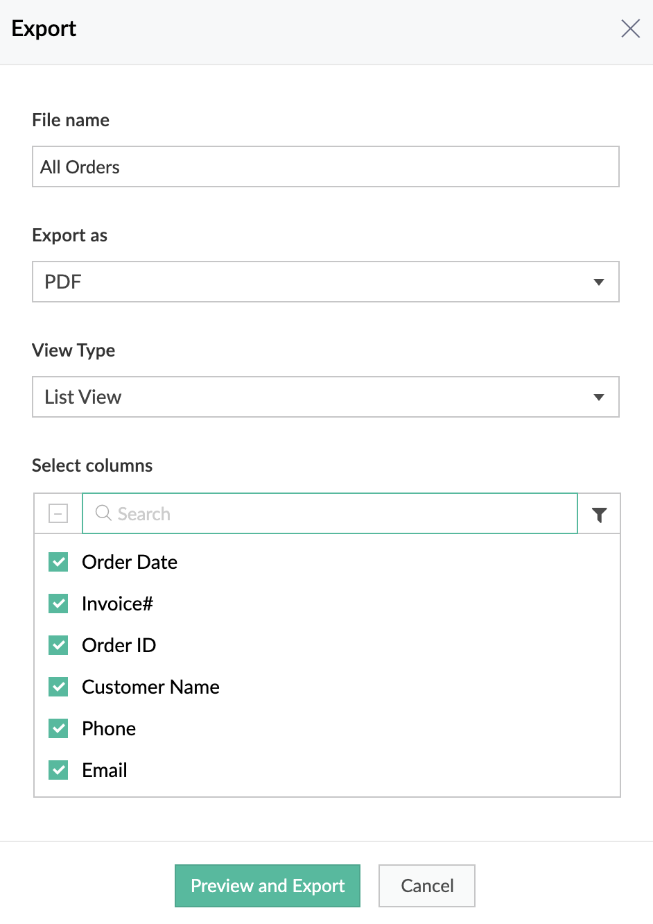 - Summary view: The records will be exported in a layout that enables you to see the detailed view of the record in a linear manner. You will be able to see all the fields and their congruent as label and value pairs. If you select the Summary view option, proceed to step 8 (you will not be able to select the required columns in this option).Note: If you have configured a record template for your report and when the summary view option is selected, then the record template will be exported as the detailed (summary) view of each record in your report.