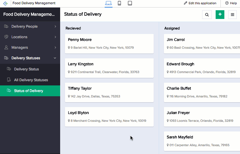 Let's assume that you are a food delivery enterprise and you have a Delivery Management application. The process involves five different stages. Your customer places the order with you using your application and the restaurant or the vendor also parallelly receives the order.The delivery manager, the vendor and the delivery person have access to the report. On receiving the notification, the order gets queued in your delivery management application, which is a kanban report. The next stage is that the delivery must be assigned to the person handling the beat or area. The manager moves the record to Assigned stage. Then the delivery person picks up the order from the restaurant at which it gets queued in Dispatched stage by the vendor. Once the package is delivered, the delivery person pushes the order to Delivered status. So here, each stage of order and delivery become the parameters used to group the records. So kanban effectively tracks the entire process with its dynamism that allows users to drag and drop the cards or records in their respective categories.